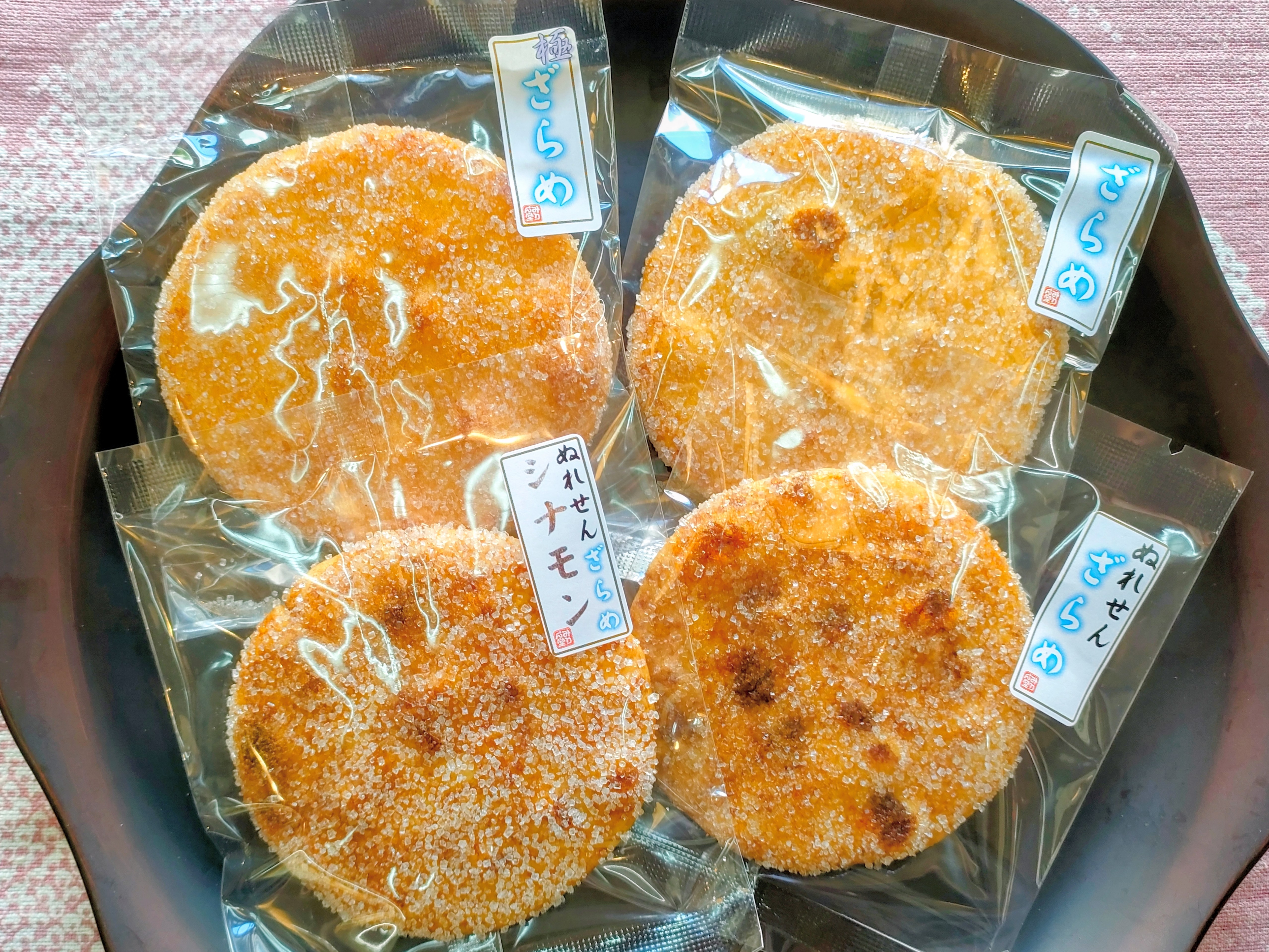 『ざらめ』・『極ざらめ』・『ぬれせんざらめ』・『ぬれせんシナモンシュガー』の4枚セットで、いずれも百年継ぎ足しの秘伝のタレと甘さのハーモニーが堪らない極上スイーツです!4枚入 670円(税込)