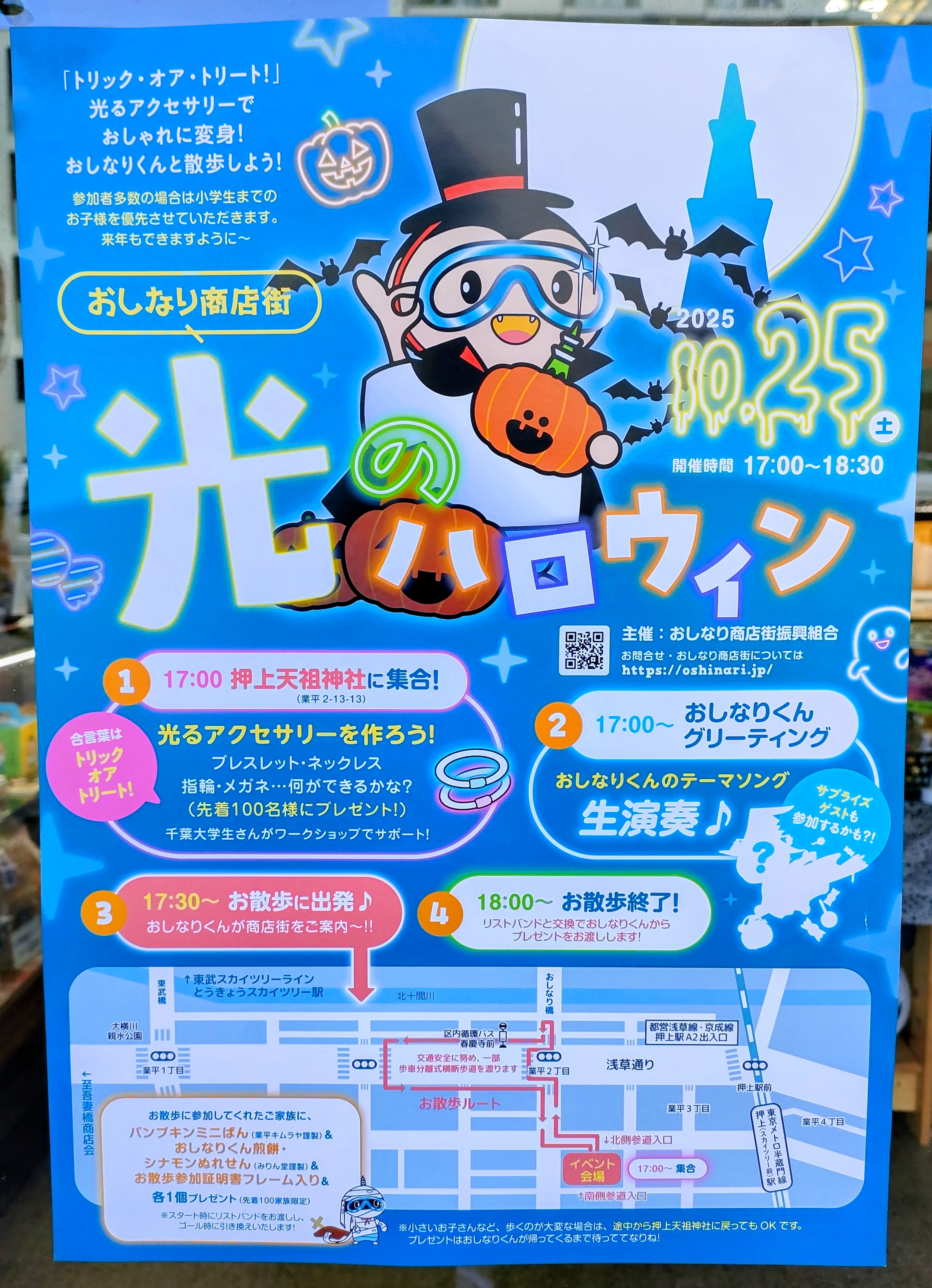 おしなり商店街 光のハロウィン 10月25日(土)に『おしなり商店街 光のハロウィン』を開催致します!当日はおしなりくんとお散歩、小学生までのお子様を優先に光るアクセサリー作り、当店のおしなりくん煎餅&シナモンシュガーぬれせん等のプレゼントもあります!是非ご参加下さい!