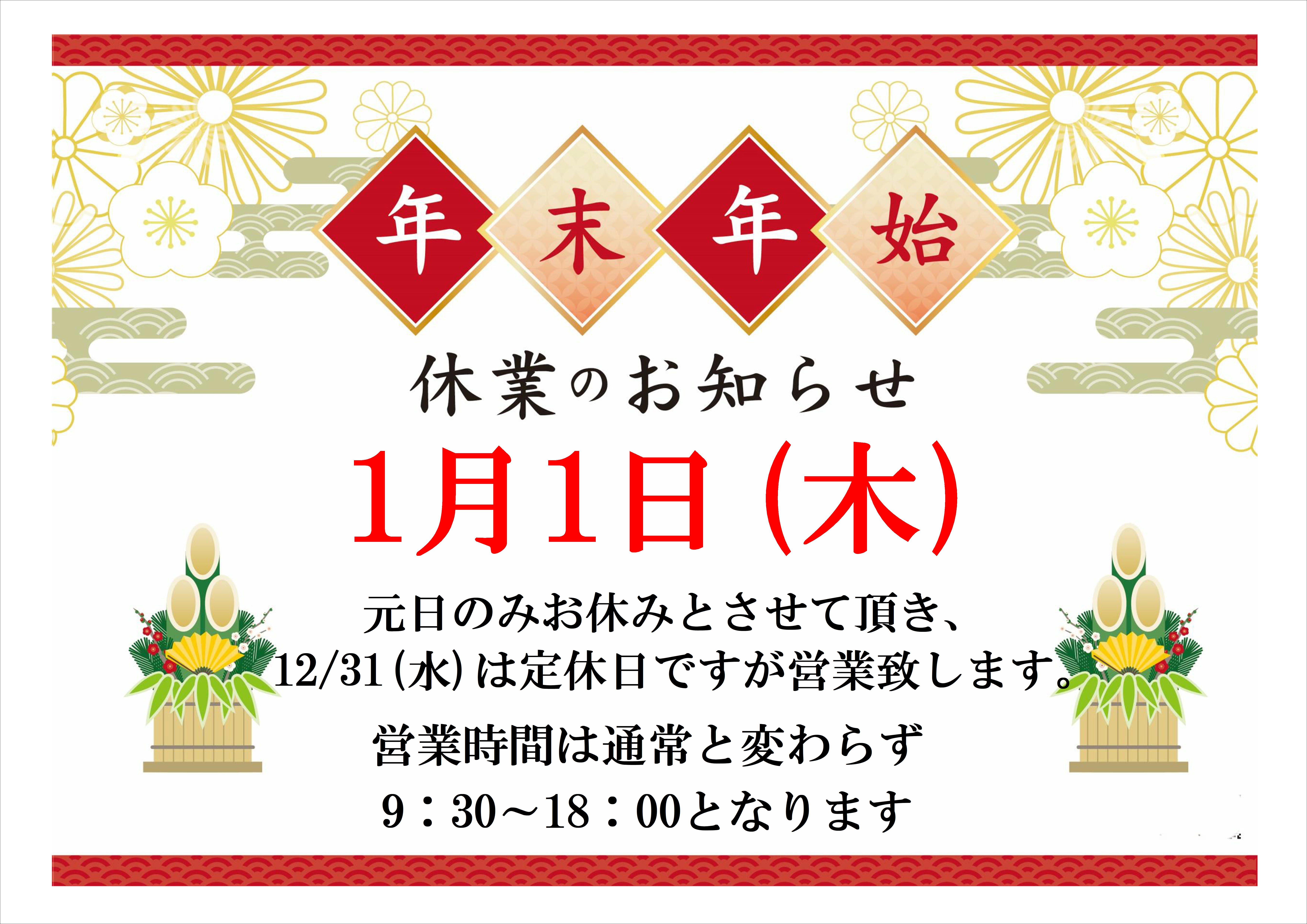 年末年始の営業について いつもご利用ありがとうございます。今年の年末年始のお知らせです。 年内は休まず営業、年始は元旦のみお休みとさせて頂きます。営業時間は通常通り9:30~18:00となります。 ご自分用はもちろん、ちょっとした手土産、年末年始のご挨拶のための進物なども多数ご用意させて頂いております。是非ともご利用下さい。